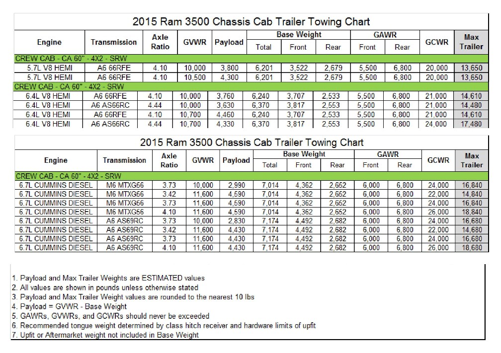 2015 RAM 3500 Chassis Cab Crew Cab 4x2 SRW Towing Chart