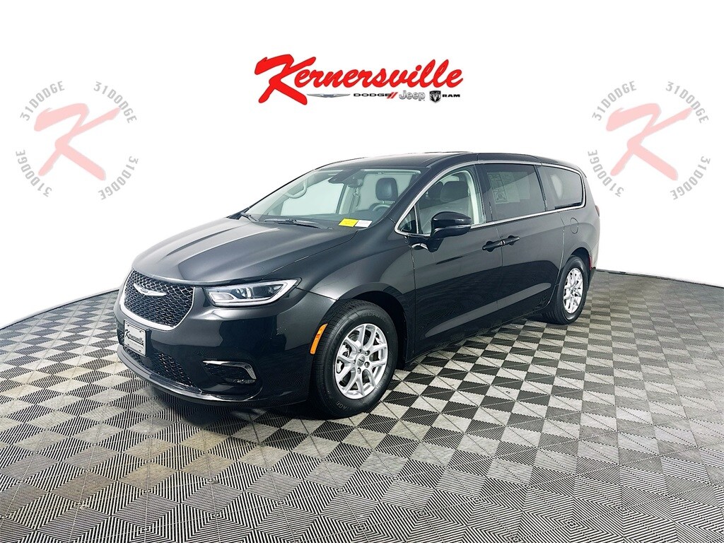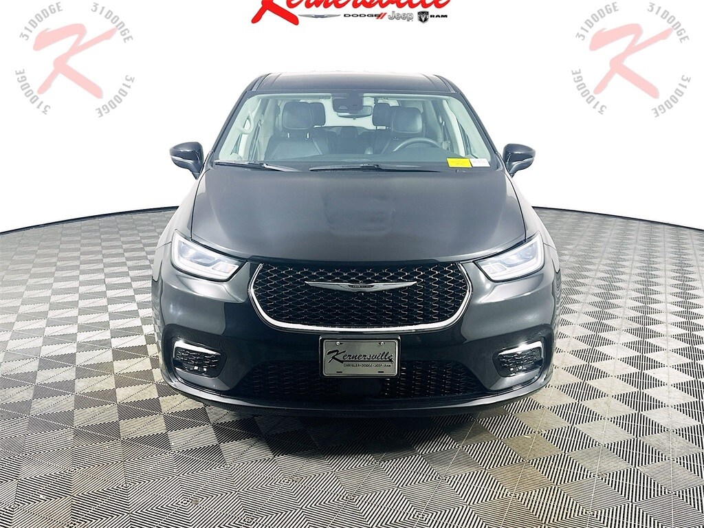 This 2023 Chrysler Pacifica Touring L in Brilliant Black Crystal Pearl Coat delivers family focused versatility, advanced safety technology, and smooth V6 performance in a modern minivan. Powered by the proven 3.6L V6 24V VVT engine paired with a 9 speed automatic transmission, this Pacifica offers responsive acceleration and comfortable highway cruising. Designed with safety in mind, it features adaptive cruise control with stop and go, blind spot and rear cross path detection, lane departure warning plus, full speed forward collision warning plus, pedestrian emergency braking, advanced brake assist, rain sensitive windshield wipers, and a comprehensive airbag system for all rows. Inside, enjoy premium Caprice leatherette bucket seats, heated front seats, a heated steering wheel, 8 way power adjustable driver seat with memory, remote start, push button start, and remote proximity keyless entry for added convenience. The flexible 2nd and 3rd row Stow N Go seating system makes it easy to switch from passenger space to cargo capacity in seconds. Technology highlights include the Uconnect 5 system with a large 10.1 inch touchscreen, Apple CarPlay, Google Android Auto, handsfree phone and audio, and intuitive controls for seamless connectivity. With power sliding doors, a power liftgate, LED lighting, and stylish aluminum wheels, this Pacifica Touring L is an excellent choice for families seeking comfort, safety, and everyday practicality in a well equipped minivan.