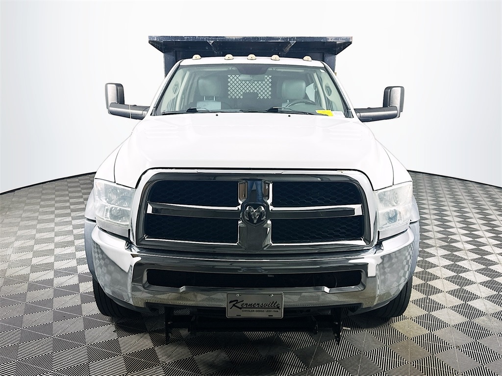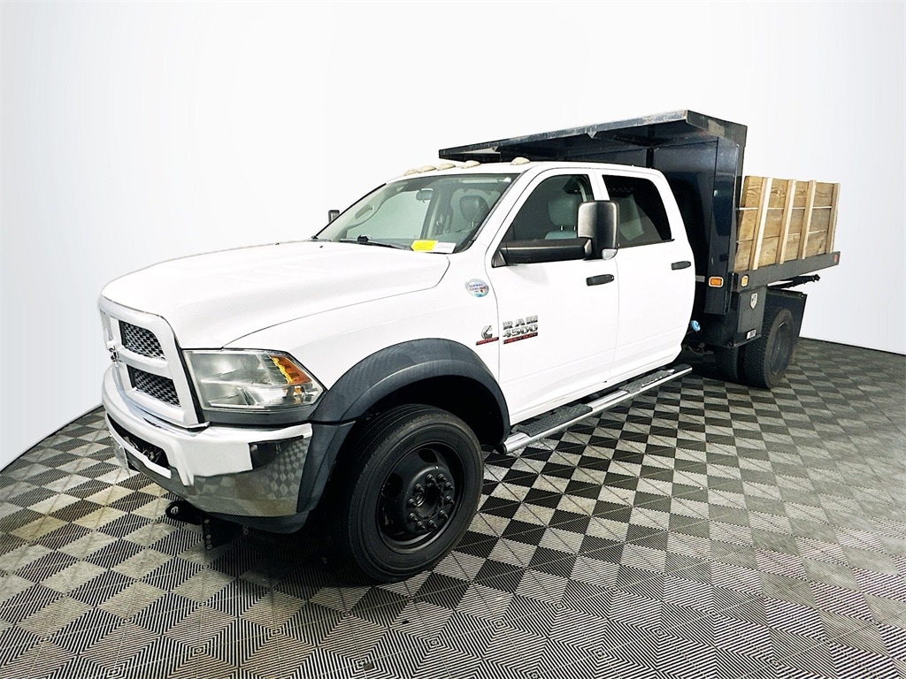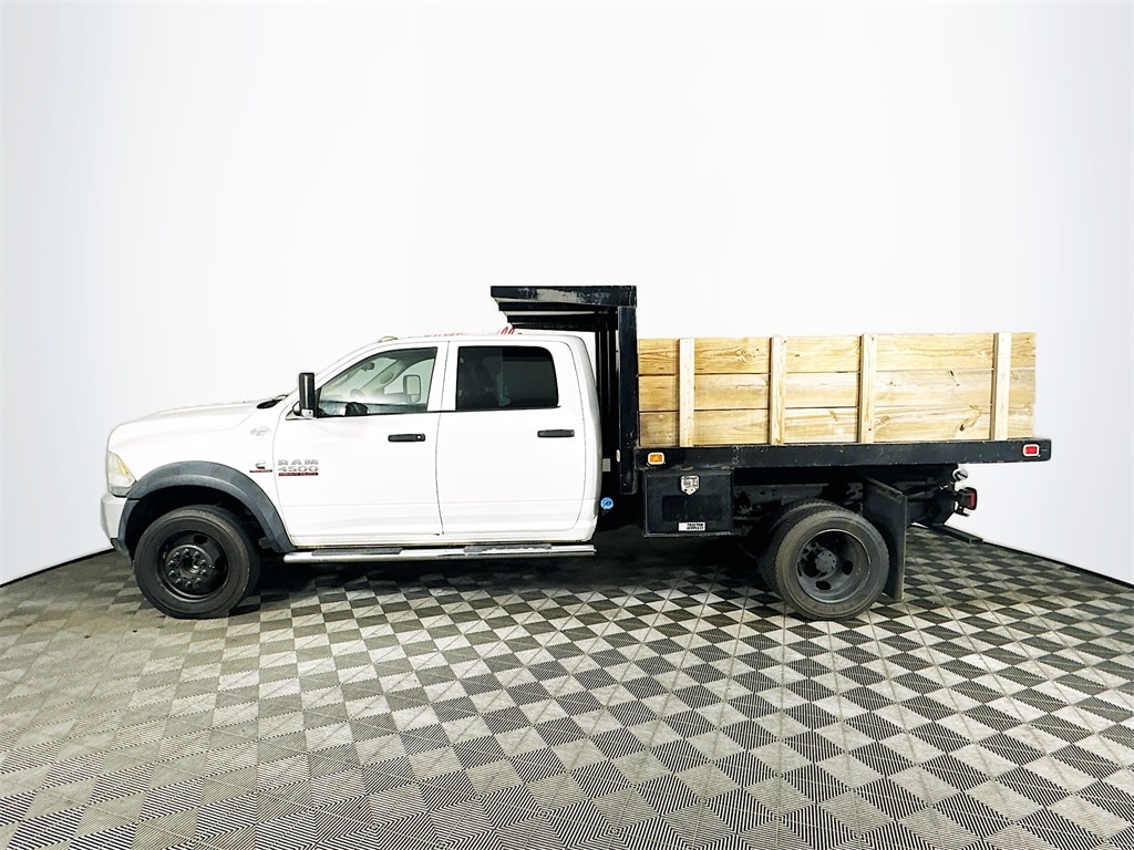 This 2014 RAM 4500HD CHASSIS TRADESMAN 173 WB DUALLY RWD Crew cab truck with dual rear wheels and a long bed has a 6.7L I6 F OHV 24V engine, automatic transmission, vinyl seats, steering wheel controls, auxiliary input, USB port, towing package, trailer brake controller, cruise control, keyless entry, and 148,343 miles. It is also equipped with 225/70R19.5G, 19.5" X 6.0" Steel Wheels, Quick Order Package 29A Tradesman, Cold Weather Group, Power Take Off Prep, Chrome Appearance Group, Ambulance Prep Group, Knapheide Steel Flatbed, Wooden Stake Sides, Steel Headache Rack w/Mesh Window Cutout, Exterior Mirrors w/Supplemental Signals, Black Front Bumper w/2 Tow Hooks, Halogen Headlamps w/Delay Off.