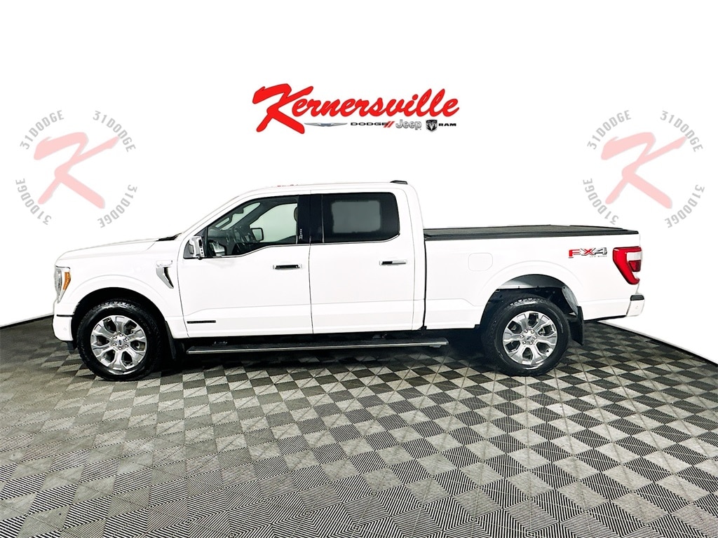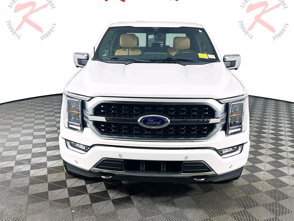 This One Owner CarFax 2022 FORD F-150 PLATINUM 4WD Crew cab truck has a 3.5L PowerBoost Full-Hybrid V6 engine, automatic transmission, leather seats, Certified Pre-Owned, navigation system, panoramic sunroof, rear-view camera, side steps, push start, remote start, heated steering wheel, heated seats, cooled seats, front power seats, steering wheel controls, auxiliary input, USB port, Bluetooth, towing package, tailgate steps, spray in bedliner, trailer brake controller, cruise control, keyless entry, and 37,962 miles. It is also equipped with 20in Hercules Tires, 20in Polished Aluminum Wheels, Equipment Group 701A, Trailer Tow Package, FX4 Off Road Package, Adaptive Steering, 360 Degree Camera, BLIS w/Cross Traffic, Evasive Steering Assist, Fordpass Connect, SYNC 4 w/ 12in Screen, Wireless Charging, B and O Audio System, Power Sliding Rear Window, Pickup Box Lighting, and Heated Mirrors, Foglamps.