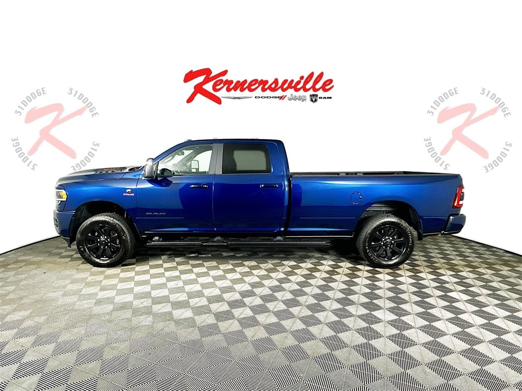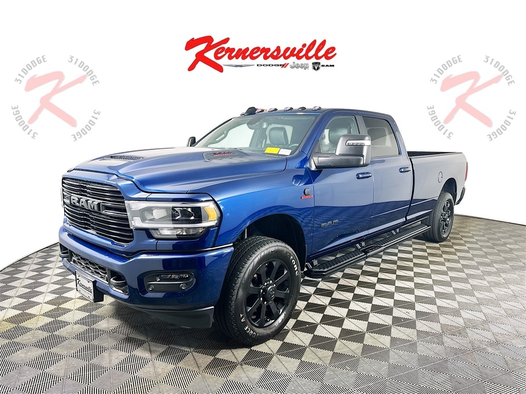 This 2024 Ram 3500 Laramie Night Crew Cab 4x4 Long Box delivers heavy duty diesel strength with luxury comfort and advanced towing technology. Powered by the legendary 6.7L Cummins Turbo Diesel engine paired with a smooth 6 speed automatic transmission, this truck provides confident pulling power for demanding jobs and long hauls. The electronic shift on the fly four wheel drive system, trailer sway damping, integrated trailer brake controller, blind spot monitoring with trailer detection, and front and rear park assist help provide control and confidence while towing or maneuvering. Inside, the Laramie cabin offers premium comfort with leather trimmed seating, heated and ventilated front seats, heated rear seats, a heated steering wheel, power adjustable pedals with memory, a large Uconnect touchscreen with navigation, Apple CarPlay and Android Auto, and a Harman Kardon premium sound system. Exterior highlights include the Night Edition appearance, LED headlamps and fog lamps, power folding heated tow mirrors, spray in bedliner, bed utility lighting, deployable bed step, and a rear power sliding window. Backed by Certified Pre Owned status, a Clean Carfax, and One Owner history, this Ram 3500 Laramie Night is built to handle serious work while delivering upscale comfort and modern technology.