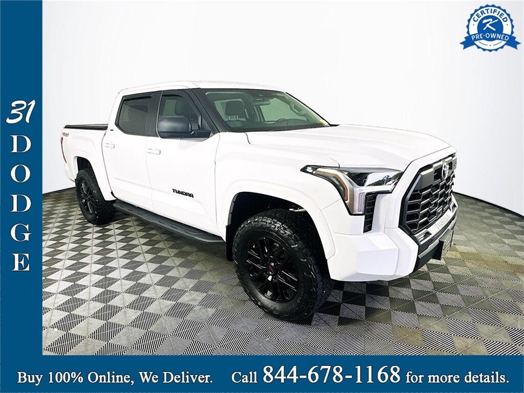 This One Owner Clean CarFax 2024 TOYOTA TUNDRA SR5 4WD Crew cab truck has a 3.4L V6 engine, automatic transmission, cloth seats, Certified Pre-Owned, rear-view camera, side steps, push start, steering wheel controls, auxiliary input, USB port, towing package, cruise control, keyless entry, and 14,034 miles. It is also equipped with 20in Recon Grappler Tires, TRD Sport Package, aluminum sport pedals, TRD Black Aluminum Running Board, 2 LCD Monitors, Distance Pacing, and Daytime Running Auto High Beam Headlamps w/Delay Off.