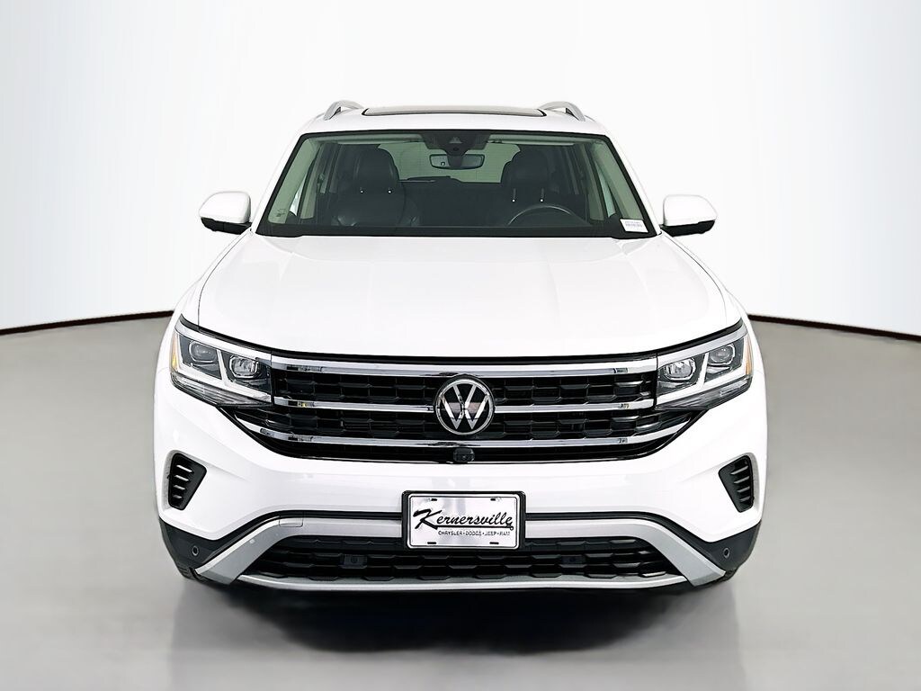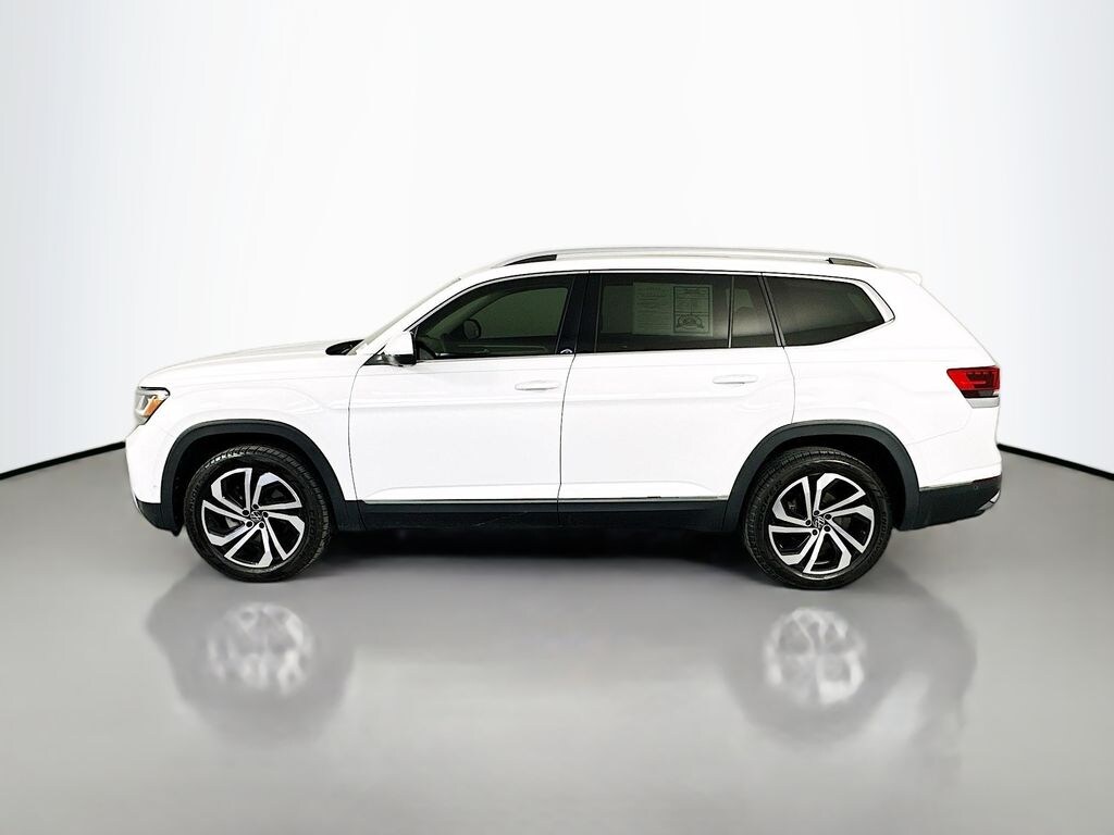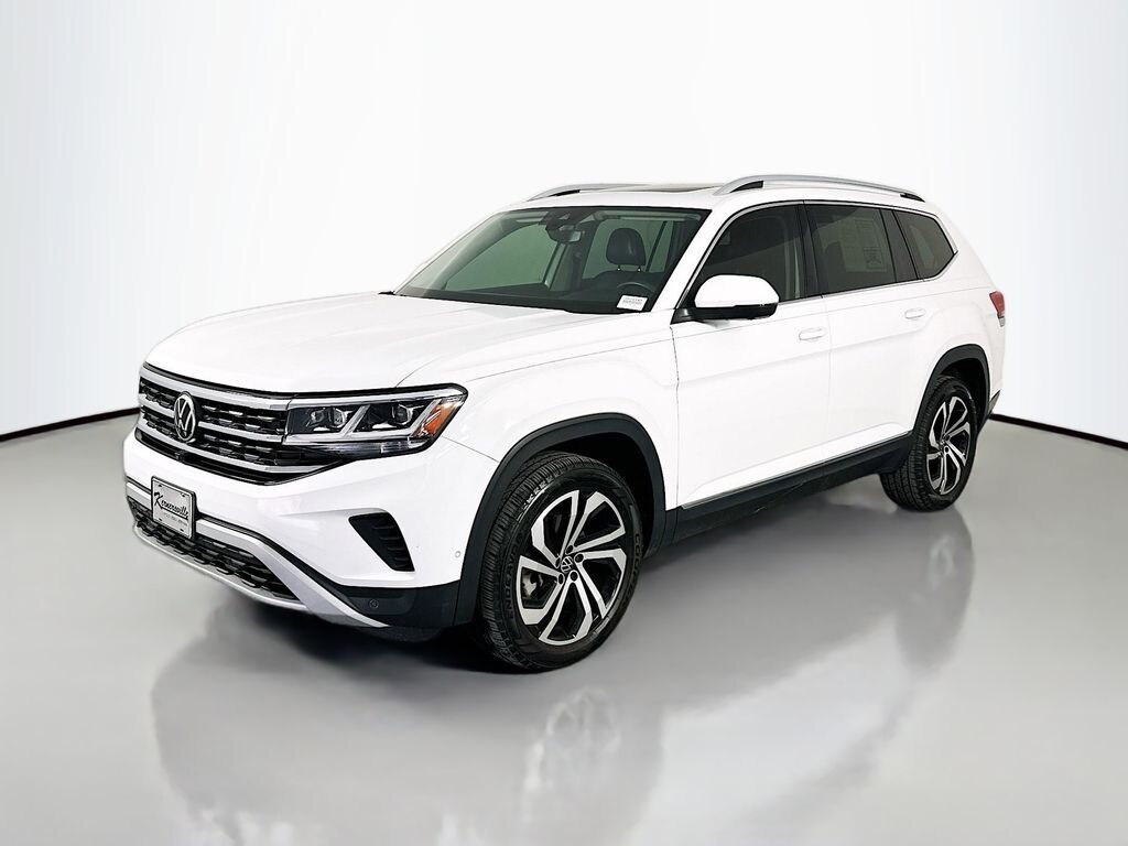 This 2021 Volkswagen Atlas SEL Premium AWD delivers powerful V6 performance, advanced safety technology, and spacious three row versatility, making it an excellent choice for families and drivers who want a refined midsize SUV. Powered by a 3.6L VR6 engine paired with an 8 speed automatic transmission and 4MOTION all wheel drive system, this Atlas provides smooth acceleration, confident handling, and capability in a variety of driving conditions. Built with advanced safety features, it includes Front Assist with forward collision warning and autonomous emergency braking, active blind spot monitor, rear traffic alert, adaptive cruise control with steering assist, park distance control with front and rear sensors, and an area view camera system with multiple viewing angles for enhanced awareness. Inside, the cabin offers a premium and spacious environment with perforated Vienna leather seating surfaces, heated and ventilated front sport seats, and a three row layout designed for comfort and flexibility. Technology highlights include a Discover Media infotainment system with an 8 inch touchscreen display, integrated navigation, Bluetooth connectivity, and intuitive controls for seamless access to media and vehicle settings. Additional features include a panoramic sunroof spanning the first and second rows, power liftgate, keyless entry, dual zone climate control, and ample storage throughout the cabin for everyday convenience. Exterior features include LED headlights with adaptive lighting, automatic high beams, rain sensing wipers with heated jets, 20 inch machined alloy wheels, roof rails, and bold Atlas styling finished in Pure White. This Volkswagen Atlas SEL Premium combines performance, comfort, and advanced technology, making it a versatile SUV ready for any lifestyle.